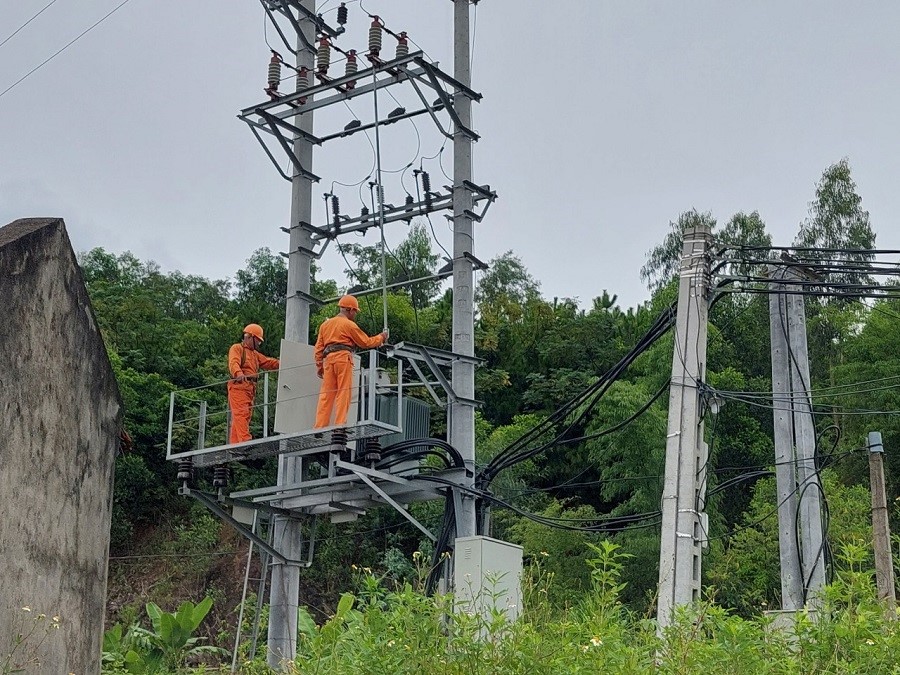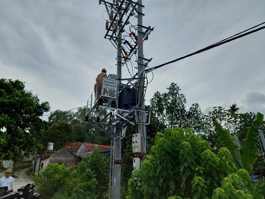Công nhân HTX sản xuất kinh doanh dịch vụ nông nghiệp Minh Tân (huyện Thủy Nguyên) kiểm tra trạm biến áp, lưới điện