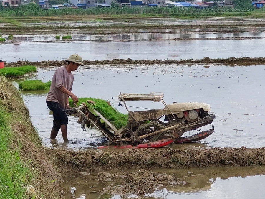 Công nhân HTX sản xuất kinh doanh dịch vụ nông nghiệp Lưu Kiếm (huyện Thủy Nguyên) đưa máy cấy áp dụng vào sản xuất
