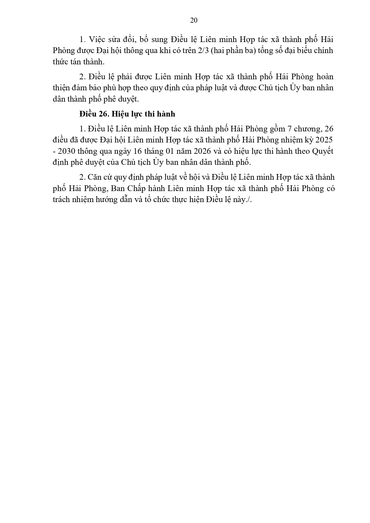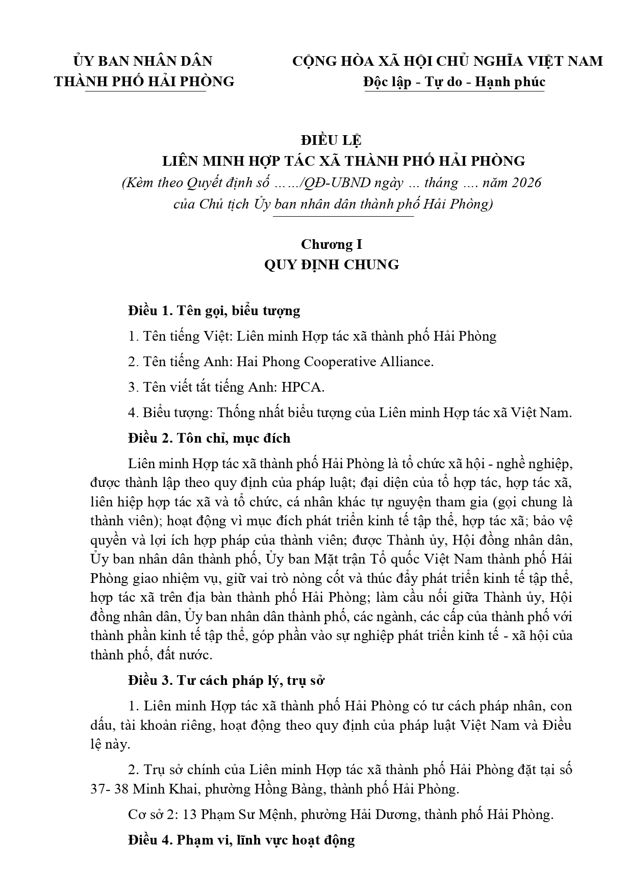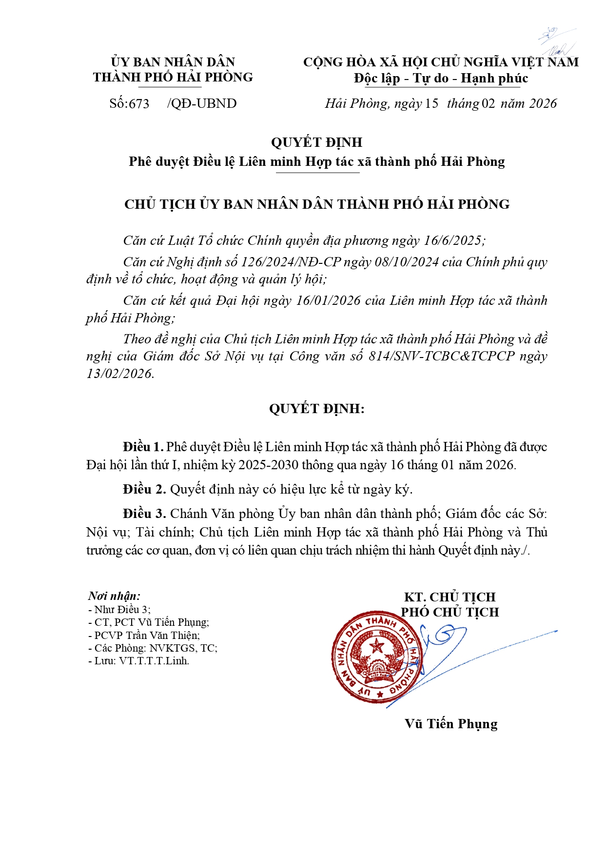 Điều lệ Liên minh Hợp tác xã thành phố Hải Phòng được phê duyệt kèm theo Quyết định số 673/QĐ-UBND ngày 15/02/2026 của Ủy ban nhân dân thành phố Hải Phòng.