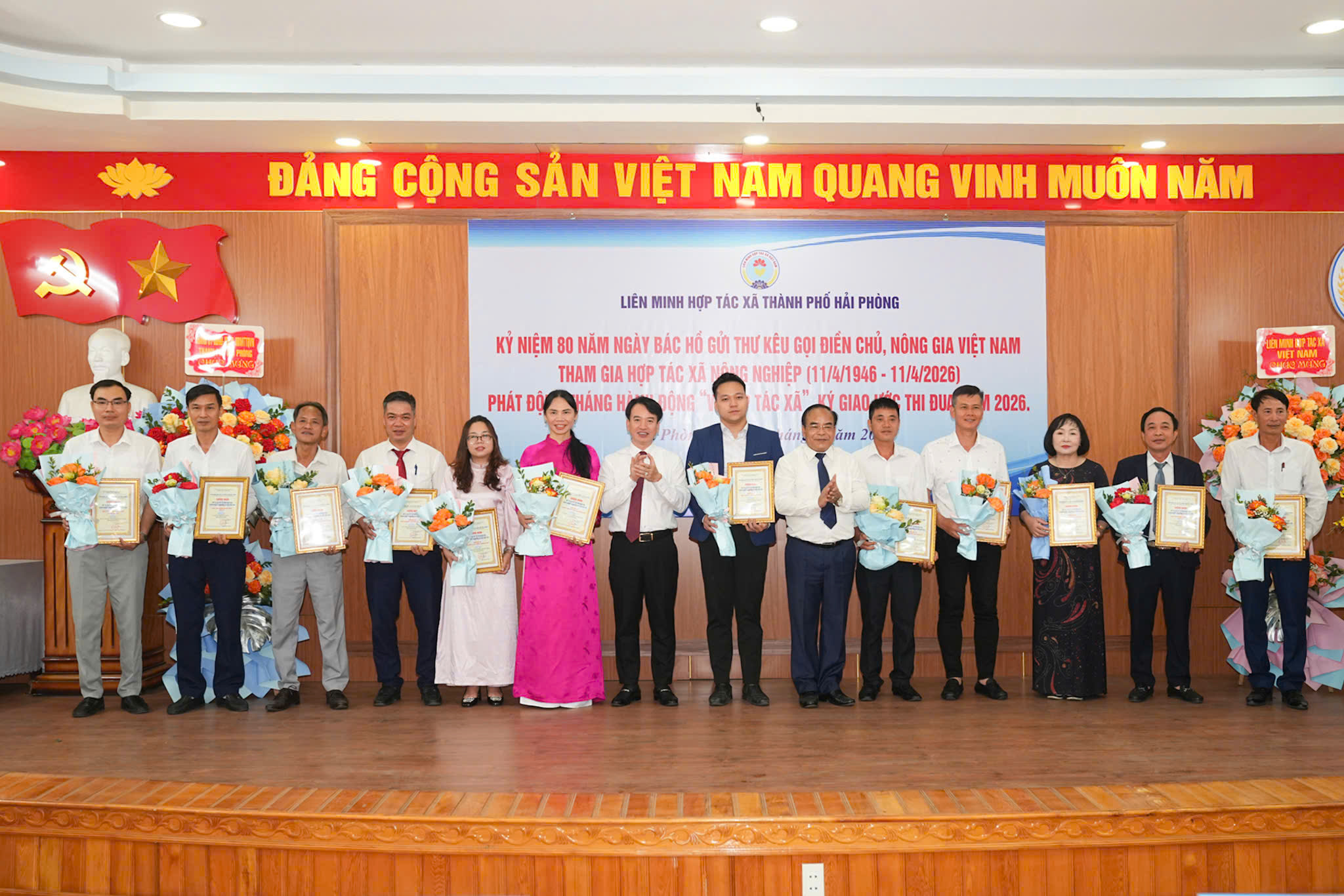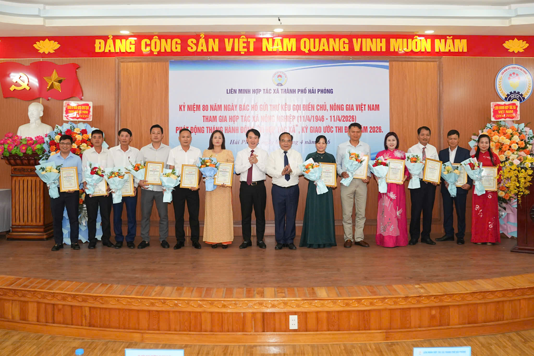 Hưởng ứng Ngày hợp tác xã Việt Nam 11/4 và phát động Tháng hành động vì HTX năm 2026, 15 HTX, Quỹ TDND, DN thành viên tiêu biểu và 20 sản phẩm tiêu biểu của HTX, DN thành viên đã được Liên minh HTX thành phố Hải Phòng tôn vinh, công nhận tại Hội nghị Ngày hội Hợp tác xã năm 2026. Trong đó, có 02 hợp tác xã tiêu biểu được Liên minh HTX Việt Nam vinh danh, trao Giải Ngôi sao Hợp tác xã (CoopStar Awards) và 03 sản phẩm của hợp tác xã được trao Giải Mai An Tiêm năm 2026 tại Lễ kỷ niệm 80 năm Ngày Bác Hồ viết thư kêu gọi điền chủ, nông gia Việt Nam tham gia Hợp tác xã nông nghiệp.